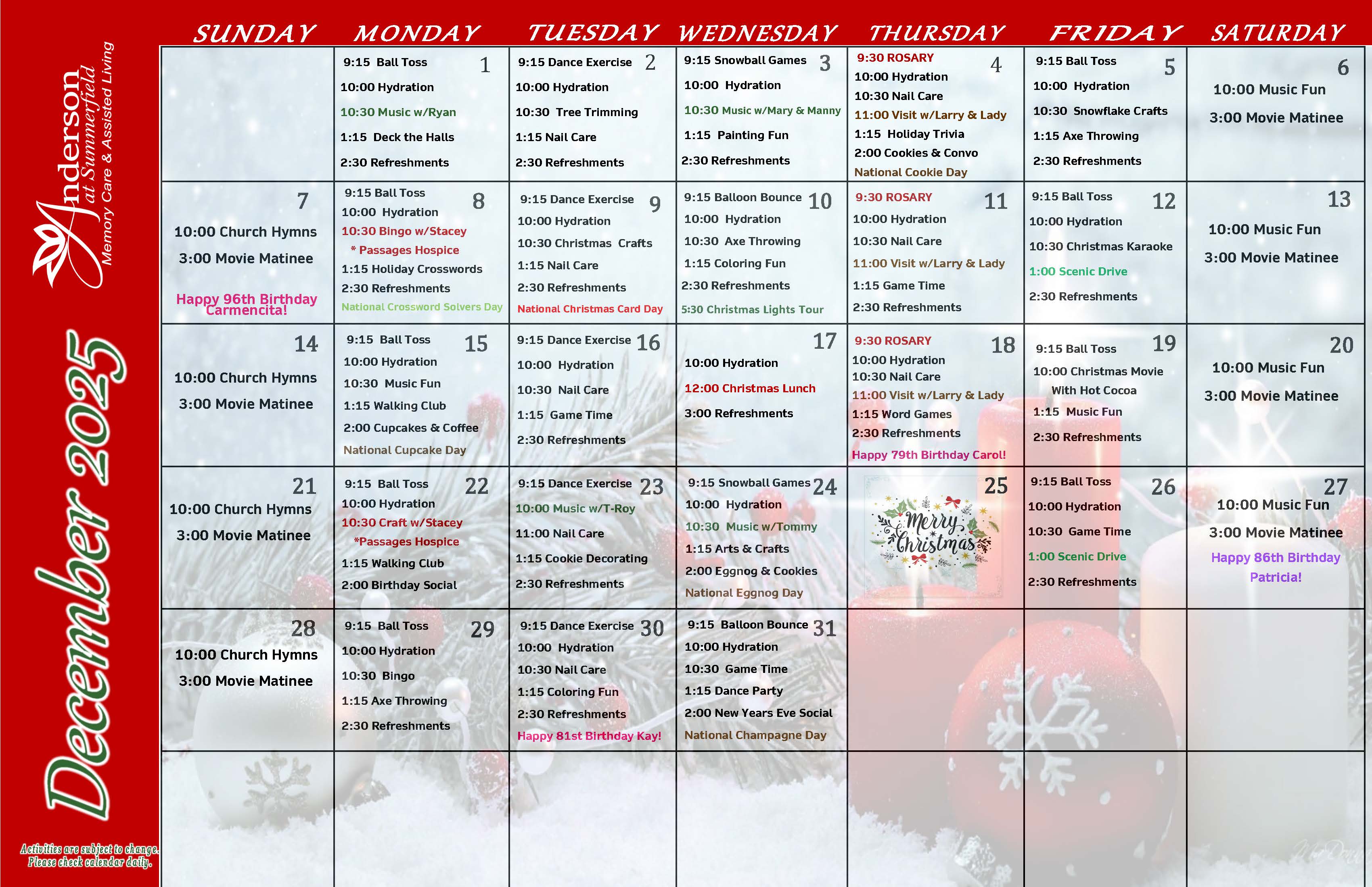 The month of December is filled with Winter activities including events Christmas and New Year's for Resident and Resident's families.