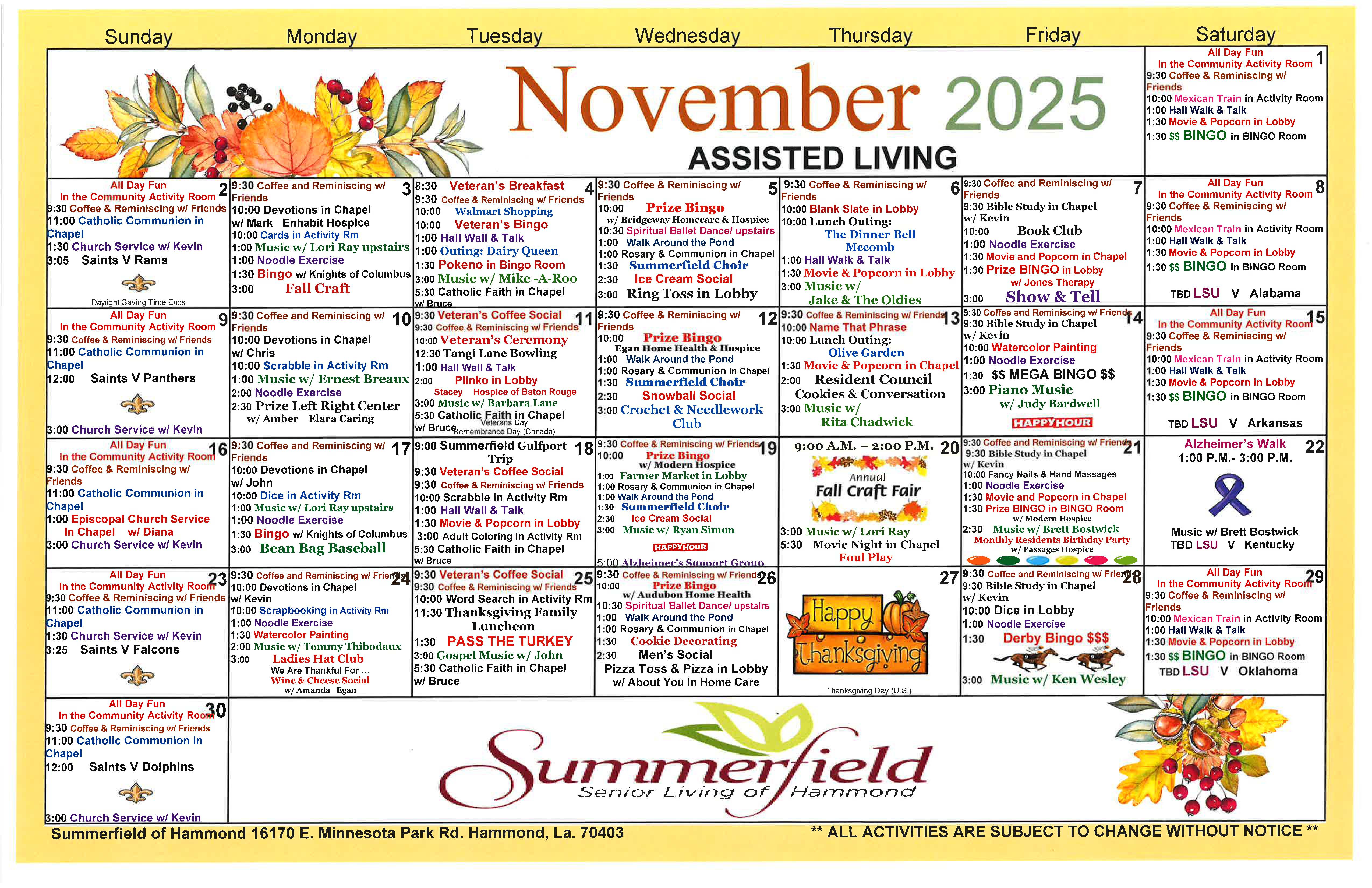 Summerfield Hammond November Calendar of Events