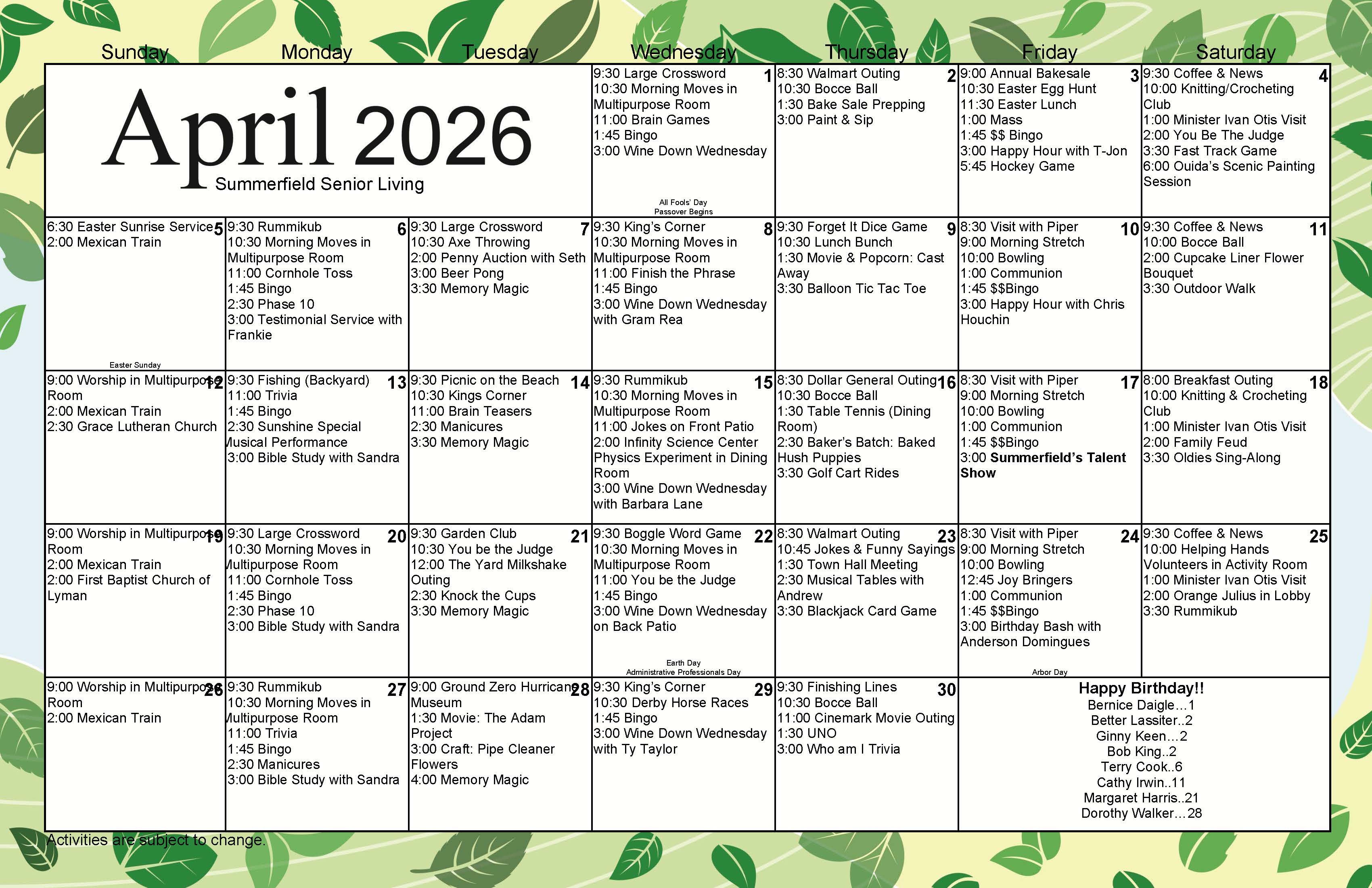 The month of April is filled with Spring time activities for Resident and Resident's families including Easter.