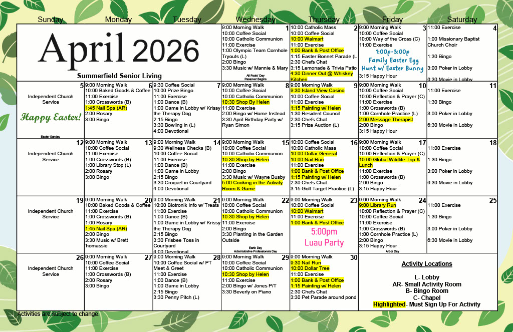 The month of April is filled with Spring time activities for Resident and Resident's families including Easter